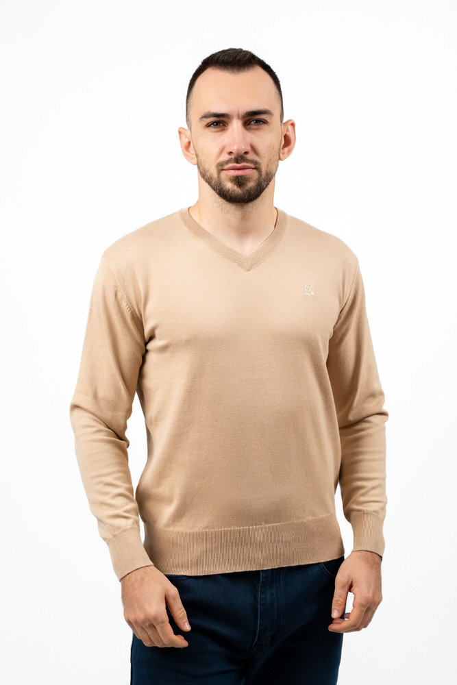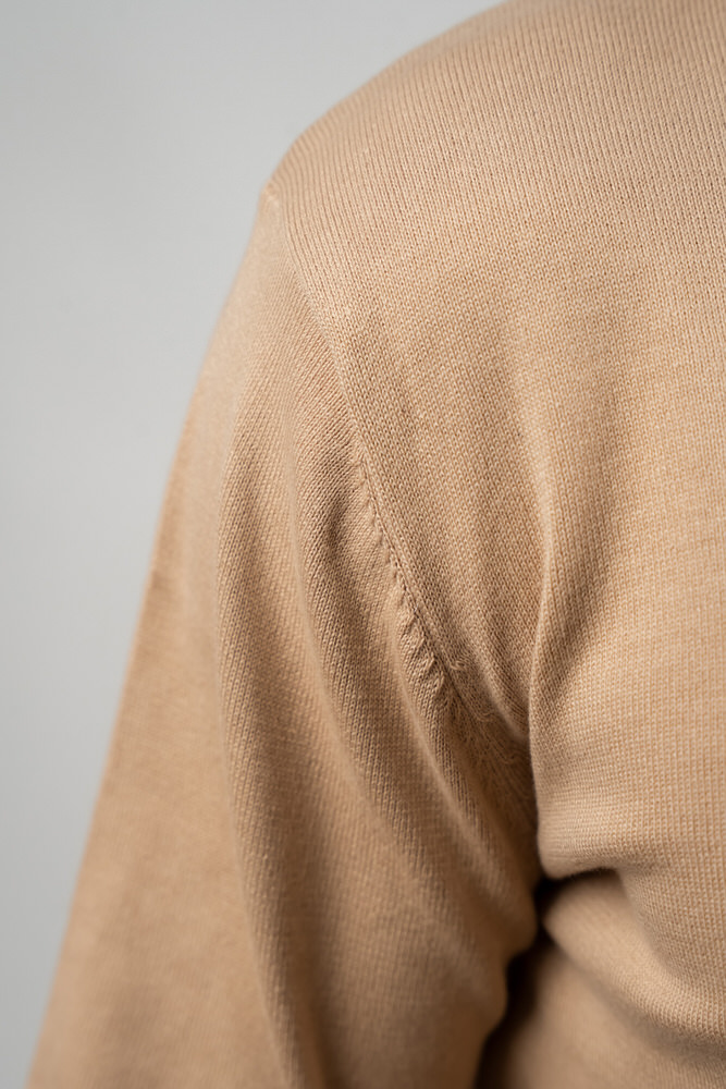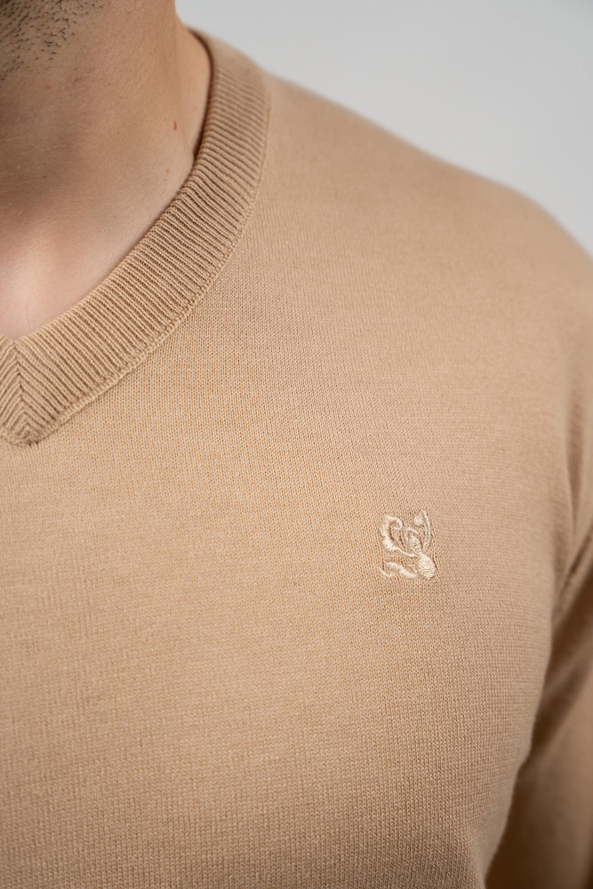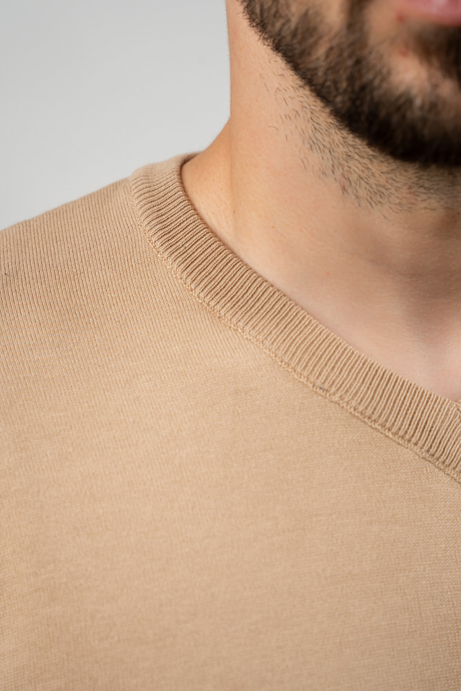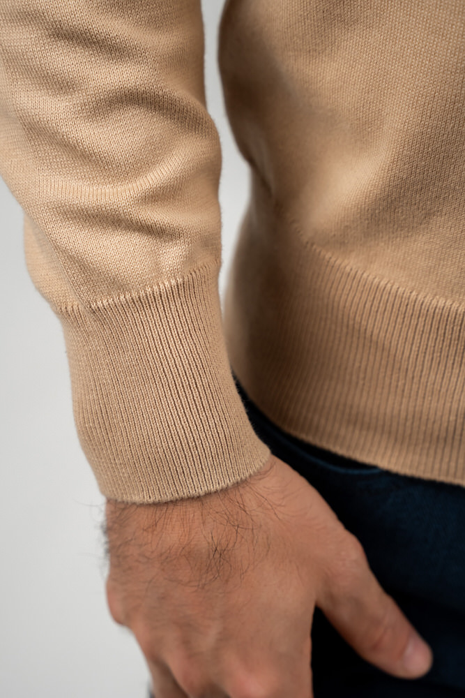 Pulover de culoare bej cu guler rotund. Este fabricat din 100% bumbac.