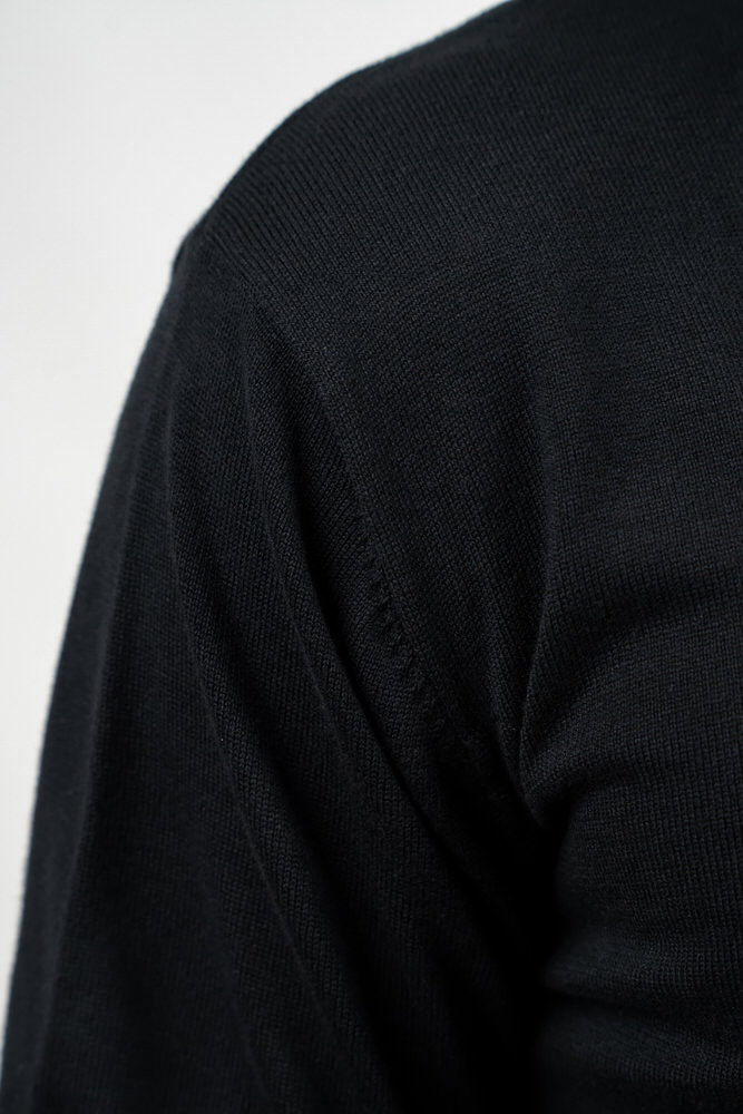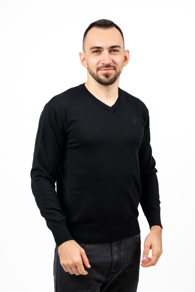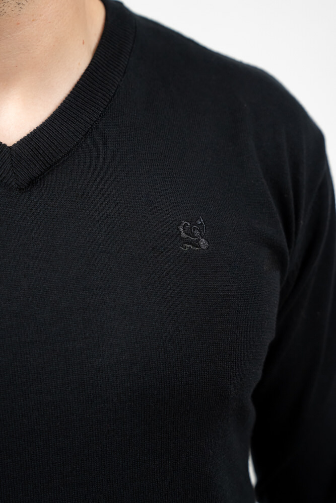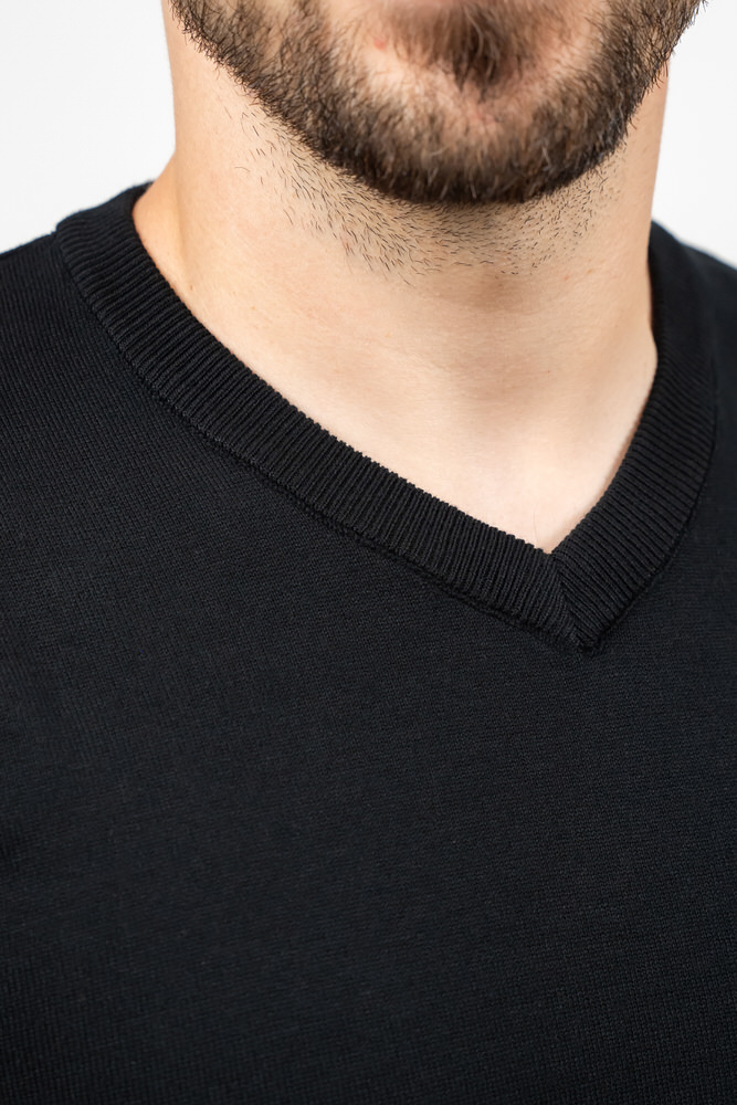 Pulover de culoare neagră cu guler în V. Este fabricat din 100% bumbac.