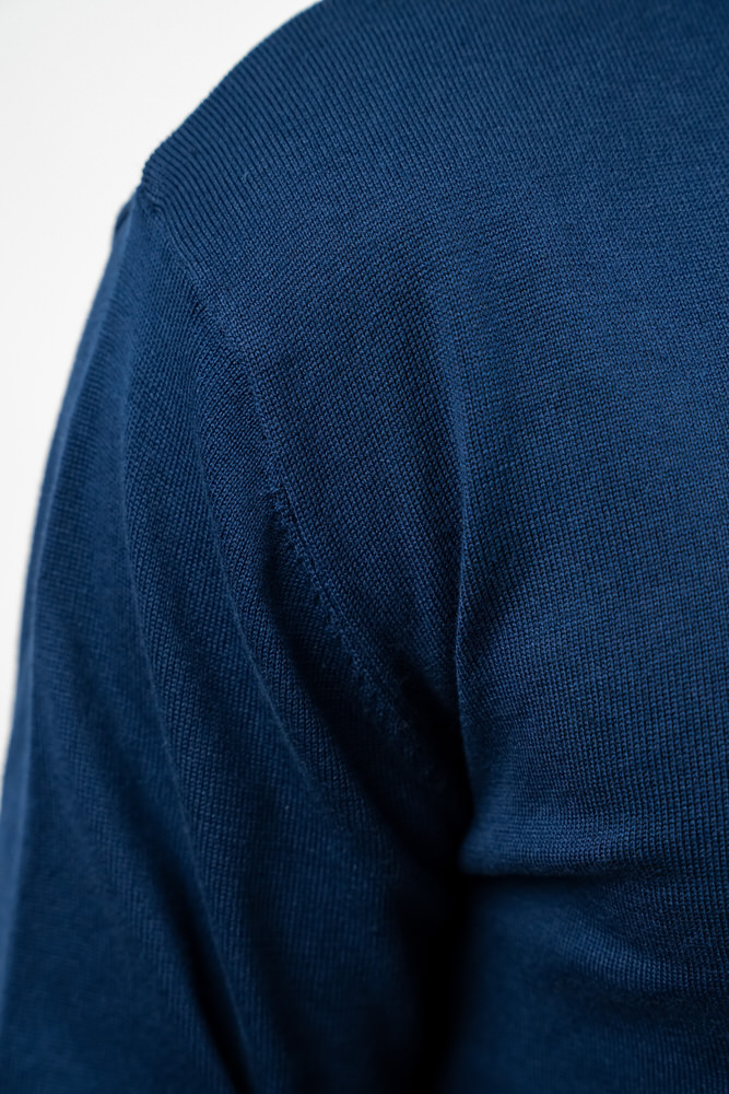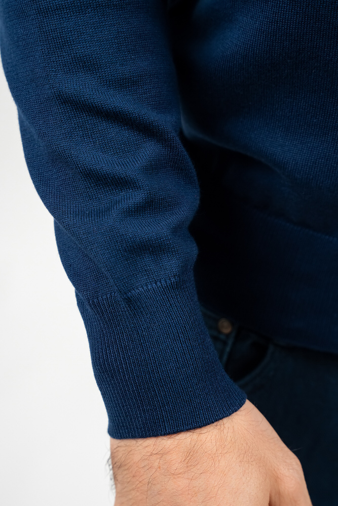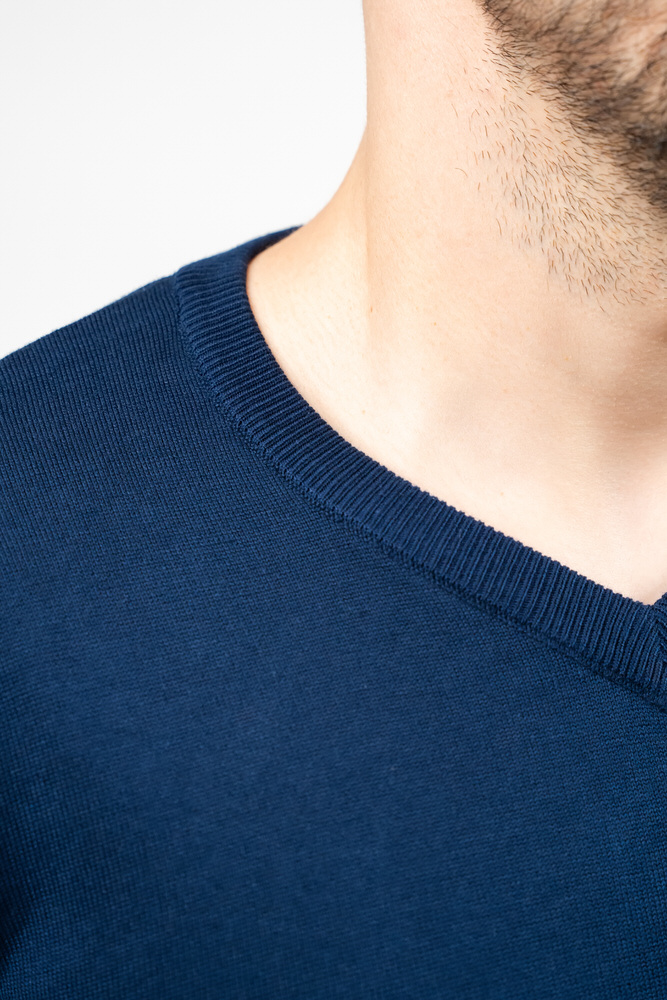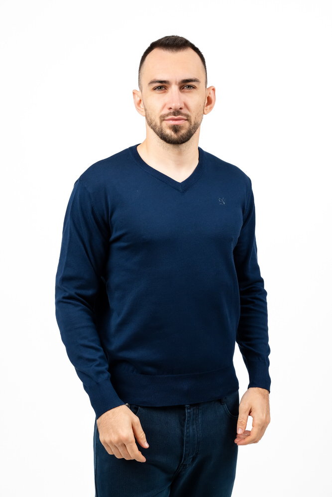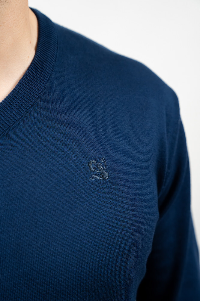 Pulover de culoare bleumarin cu guler în V. Este fabricat din 100% bumbac.