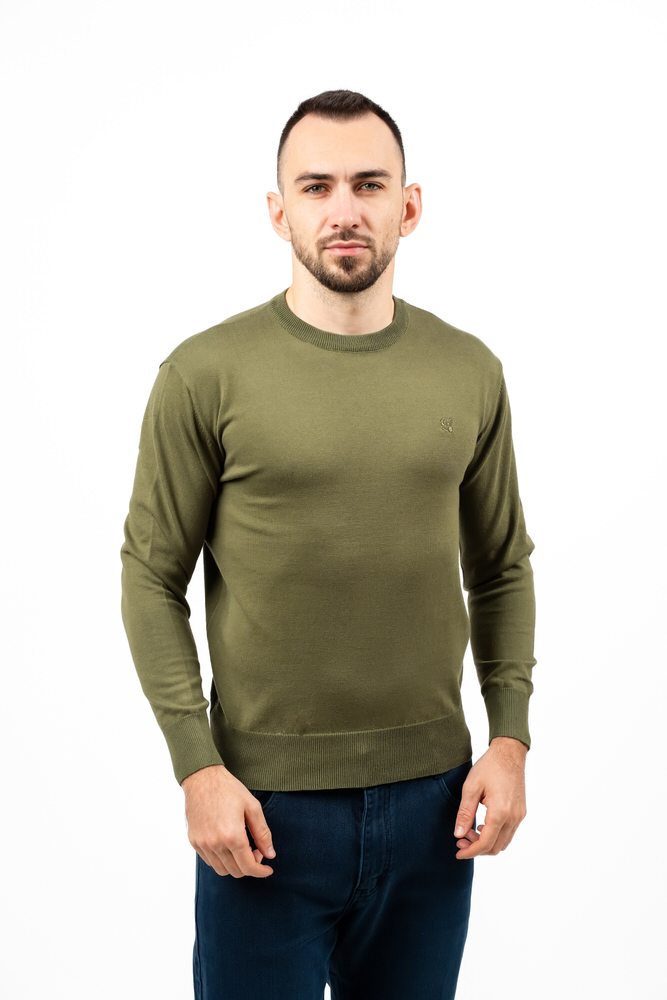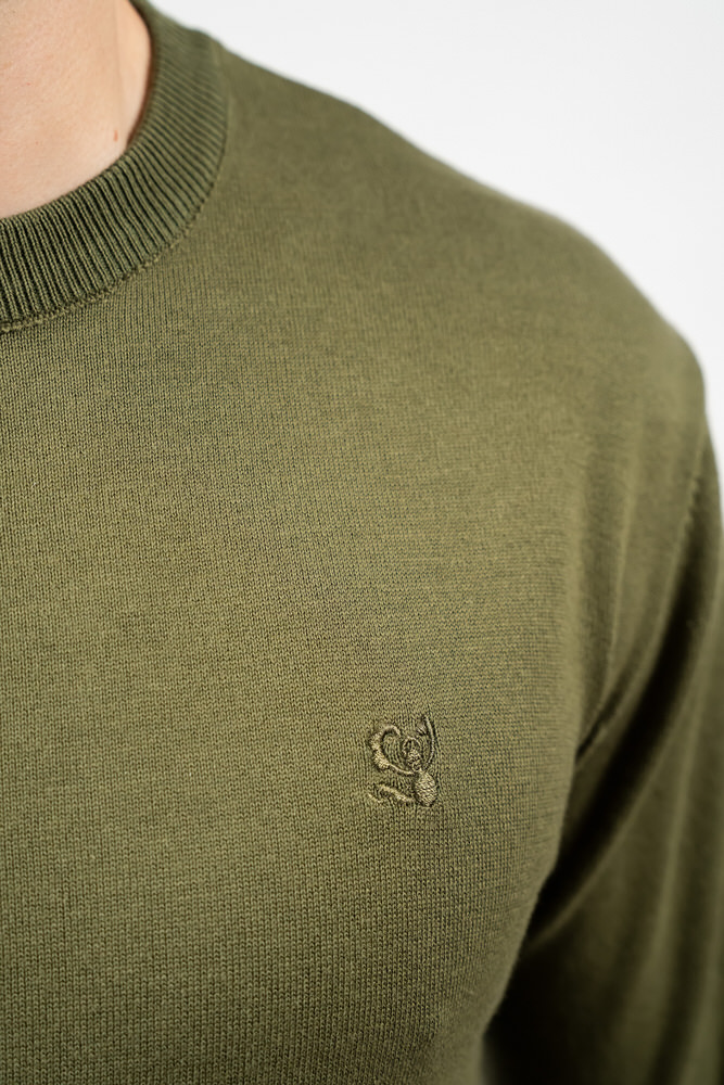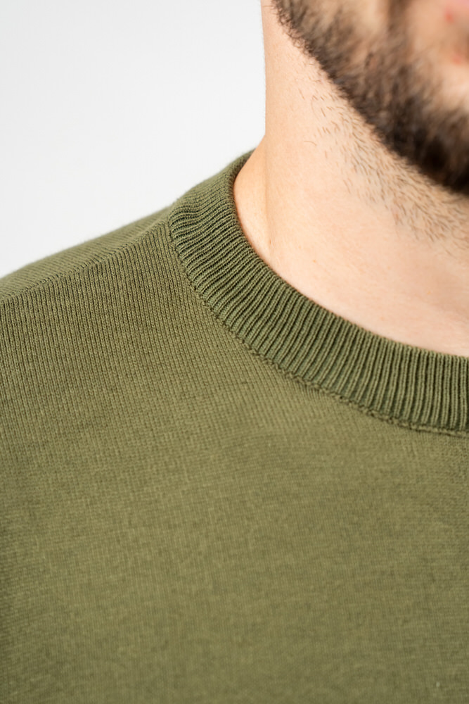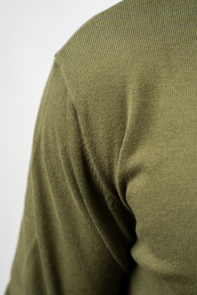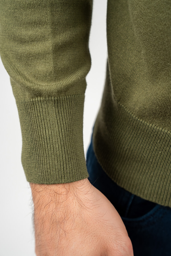 Pulover de culoare verde militar cu guler în V. Este fabricat din 100% bumbac.