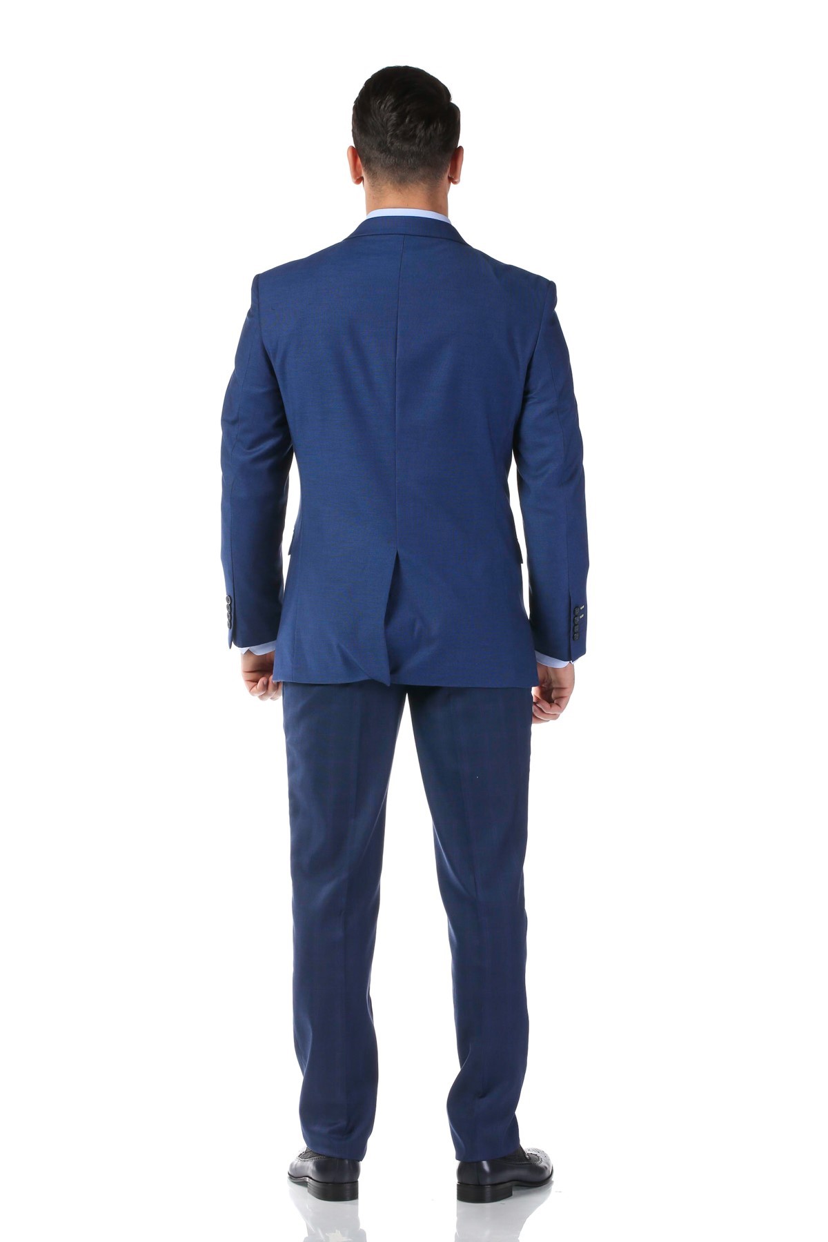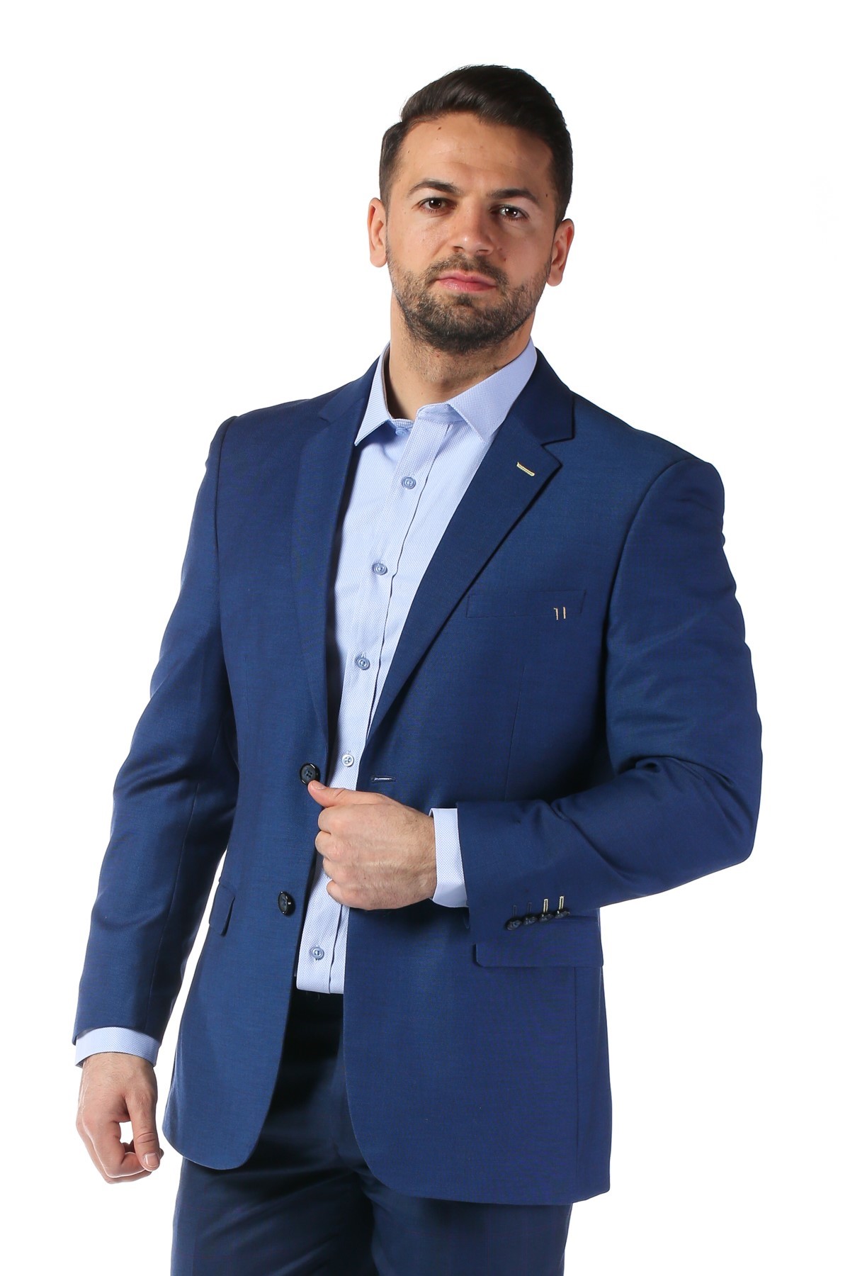 Sacou barbati de culoare albastra. Aceasta piesa vestimentara este confectionata din 20% lana, 40% poliester si 40% vascoza. Sacoul are croi regular si guler rever crestat cu butoniera decorativa, dispune de 2 buzunare cu clapa, un buzunar pentru batista si 3 buzunare interioare