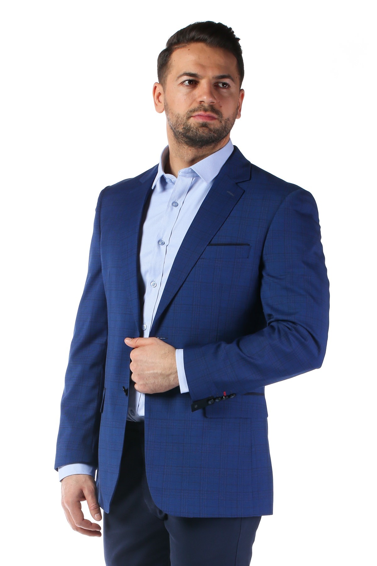 Sacou barbati in carouri, de culoare albastra. Aceasta piesa vestimentara este confectionata din 20% lana, 40% poliester si 40% vascoza. Sacoul are croi regular si guler rever cu butoniera decorativa, dispune de 2 buzunare cu clapa, un buzunar pentru batista si 3 buzunare interioare