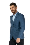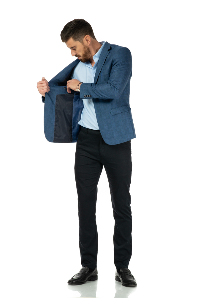 Sacou barbati albastru in carouri. Aceasta piesa vestimentara este confectionata din 20% lana, 40% poliester si 40% vascoza. Sacoul are croi slim cu guler rever, doua buzunare cu clapa, unul pentru batista, doua buzunare interioare si doua slituri la spate.