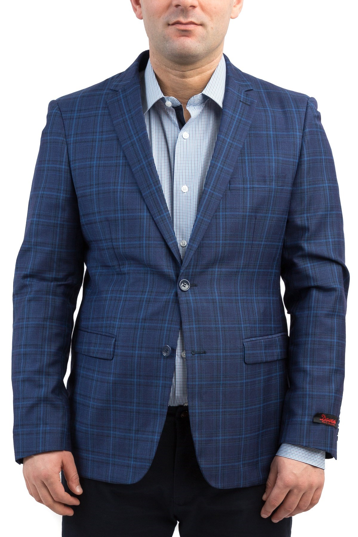 Sacou barbati de culoare bleumarin in carouri. Sacoul se inchide cu doi nasturi, are doua buzunare cu clapa in fata, un buzunar in partea de sus pentru batista si doua buzunare interioare. Sacoul are un rever crestat cu o butoniera decorativa iar manseta are patru nasturi albastri. Este confectionat din 50% lana si 50% poliester.