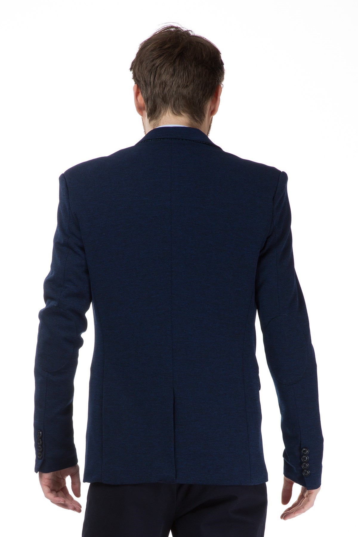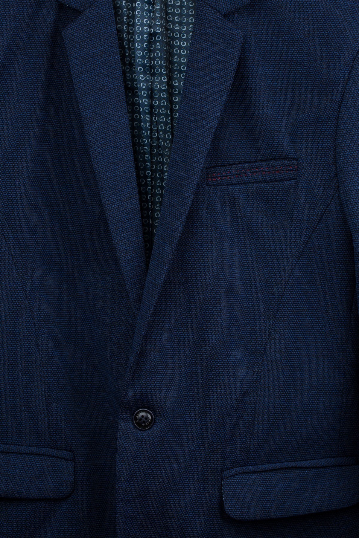 Sacou barbati slim elegant, de culoare bleumarin. Sacoul se incheie cu un singur nasture, are gulerul cu rever crestat, iar pe acesta are o butoniera decorativa. Aceasta piesa vestimentara este confectionata din 97% poliester si 3% spandex.