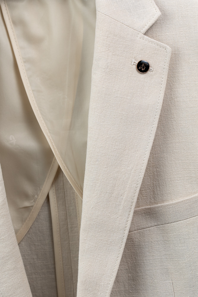 Sacou slim cu guler rever, două buzunare în față și unul la piept, două buzunare interioare și două șlițuri la spate.