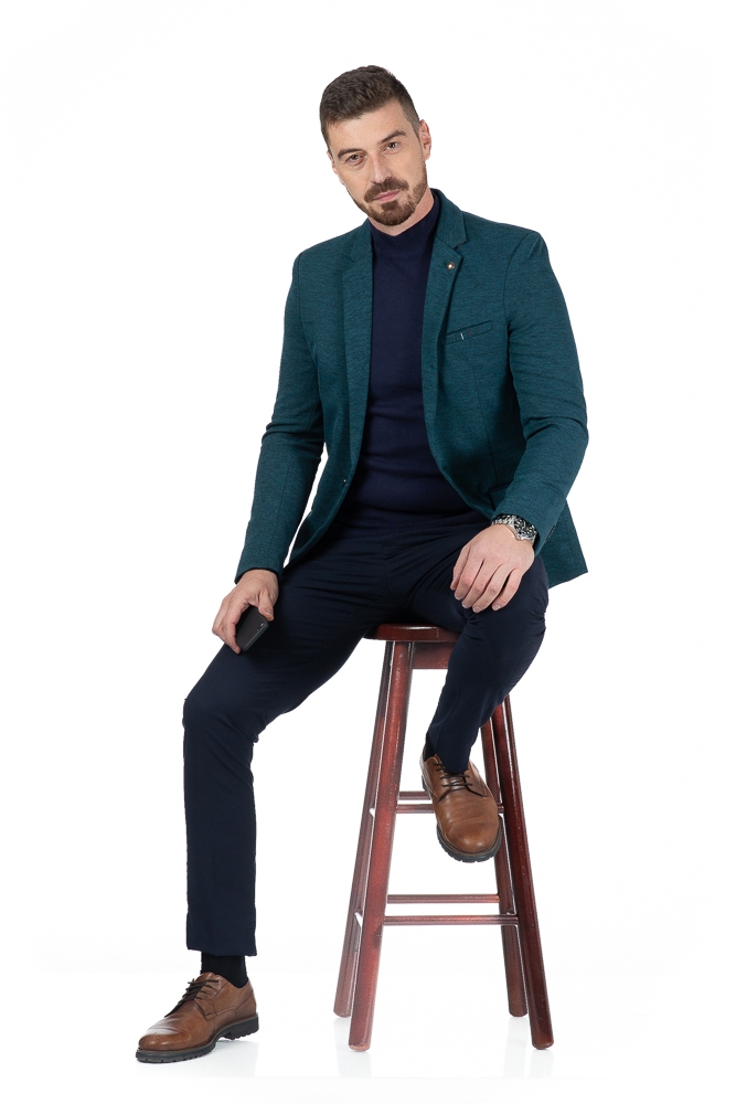 Sacou casual croiala slim cu guler rever crestat. Are doua buzunare cu clapa in fata, un buzunar pentru batista, doua buzunare interioare si slit la spate.