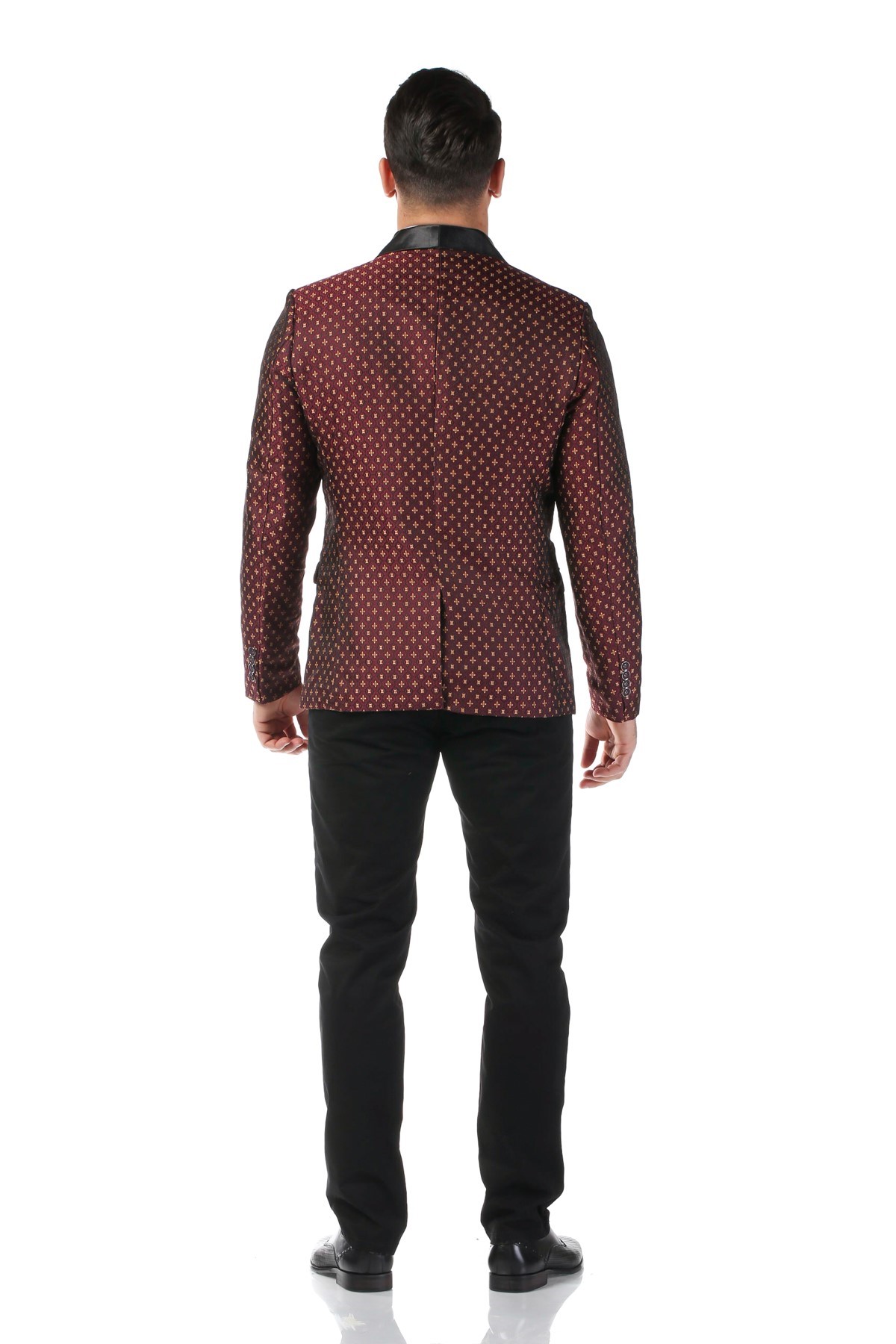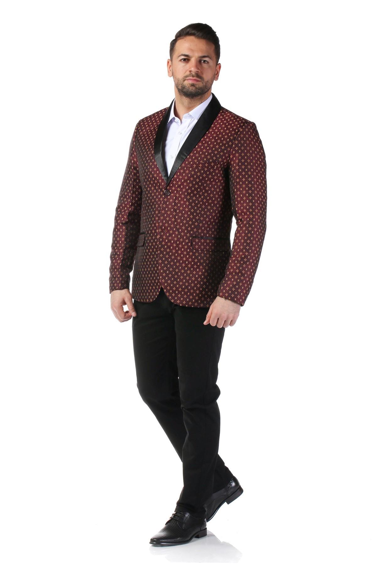 Sacou barbati de culoare visinie cu imprimeu floral. Aceasta piesa vestimentara este confectionata din 98% poliester si 2% spandex. Sacoul are croi slim si guler sal, dispune de 2 buzunare cu clapa, un buzunar pentru batista si 2 buzunare interioare