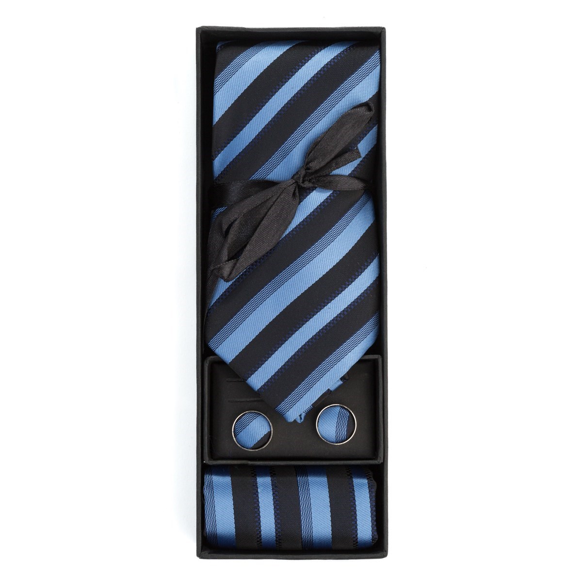 Set compus din trei piese: cravata de 7cm, batista 20x20cm si butoni. Cravata si batista sunt confectionate din poliester 100%. Setul este de culoare bleu cu dungi negre si se potriveste la un costum uni de culoare deschisa.