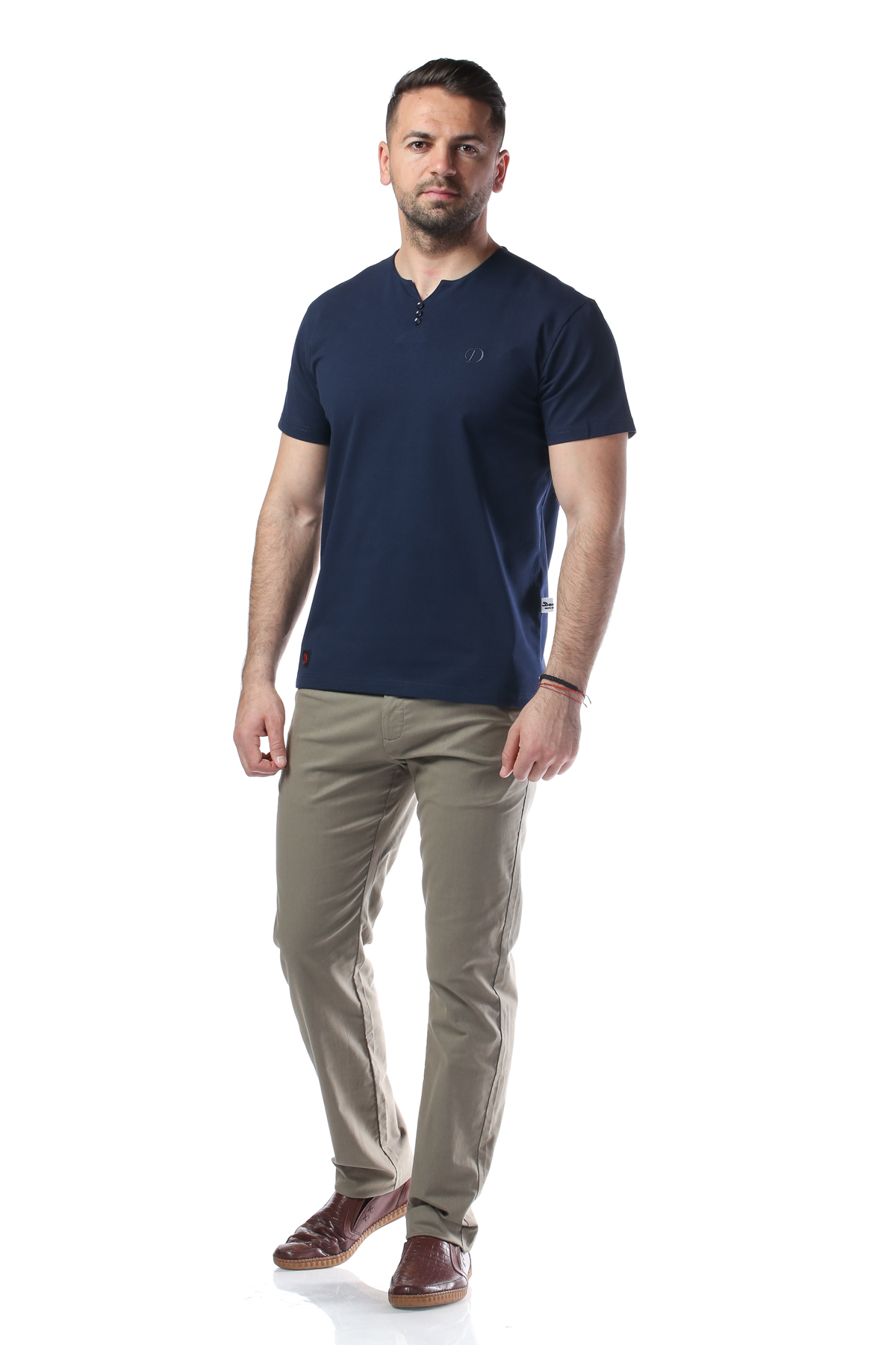 Tricou barbati de culoare bleumarin. Tricoul are guler in v si fenta cu 3 nasturi iar maneca este scurta. Este realizat din bumbac 95% si licra 5%.