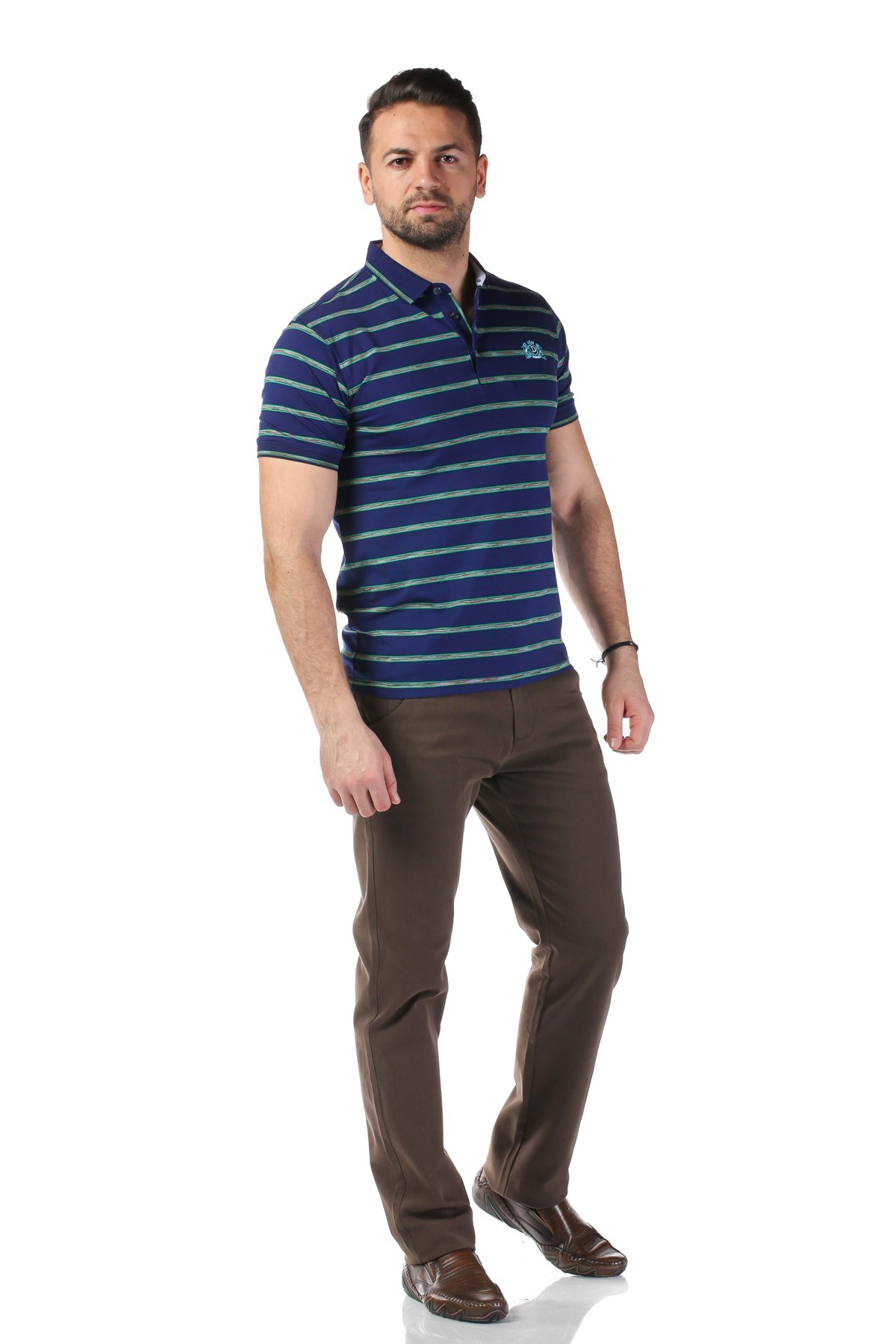 Tricou barbati de culoare bleumarin cu dungi verzi. Tricoul este model polo, gulerul este reiat si are fenta cu 3 nasturi iar maneca este scurta. Este realizat din bumbac 95% si lycra 5%.