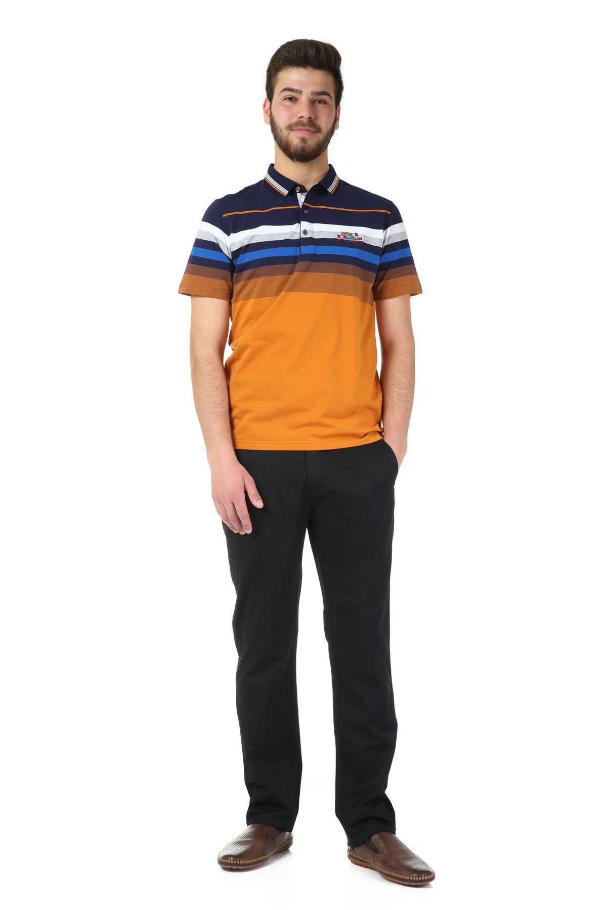 Tricou barbati de culoare bleumarin, realizat din bumbac 95% si spandex 5%. In partea de sus este de culoare bleumarin cu dungi iar in partea de jos este maro, are gulerul polo reiat cu fenta si nasturi. In partea stanga la piept este inscriptionat cu brandul Dovani si este usor de asortat.
