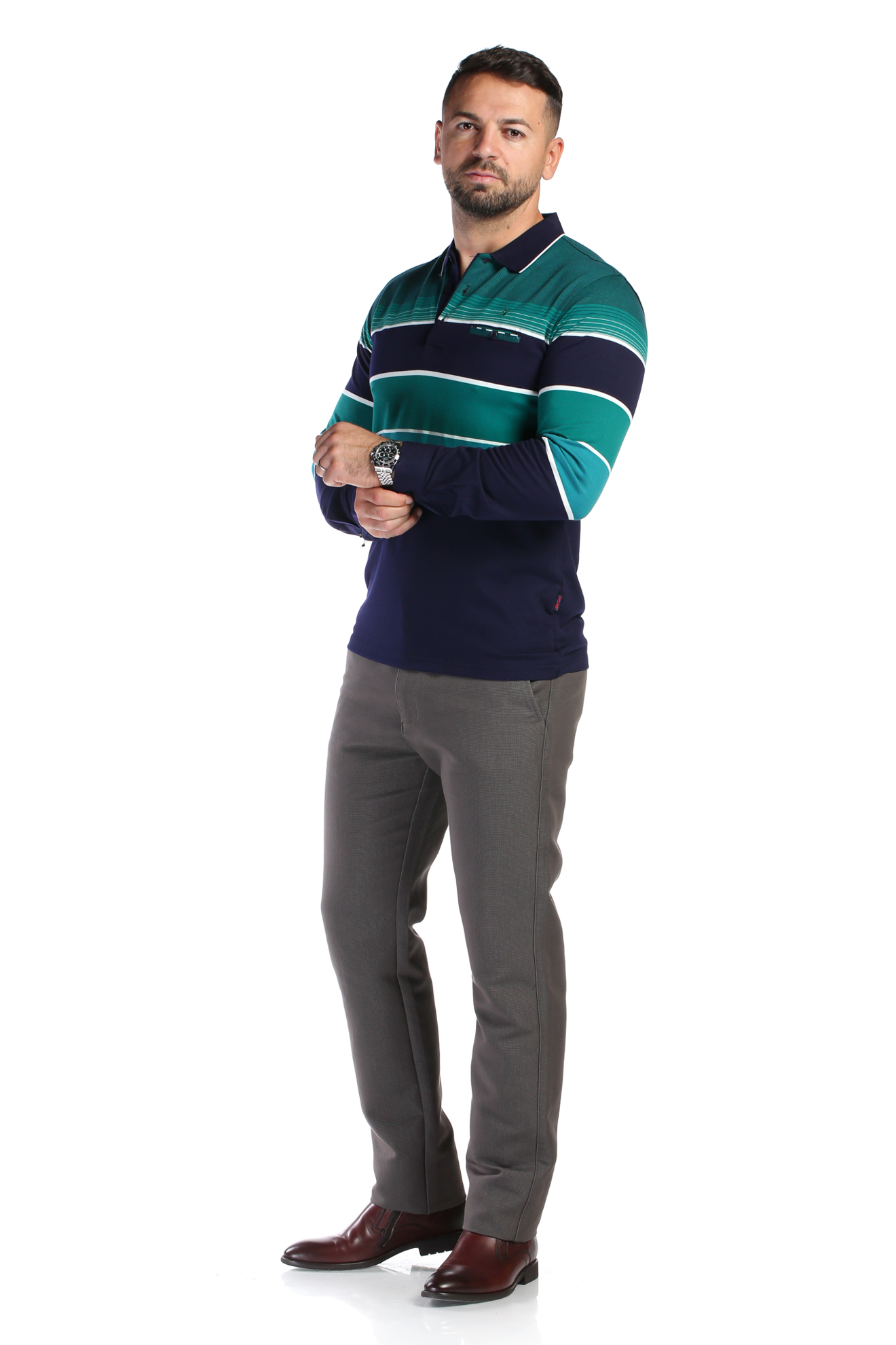 Tricou polo, fenta cu trei nasturi, guler reiat,buzunar pe partea stanga si maneca lunga cu manseta.