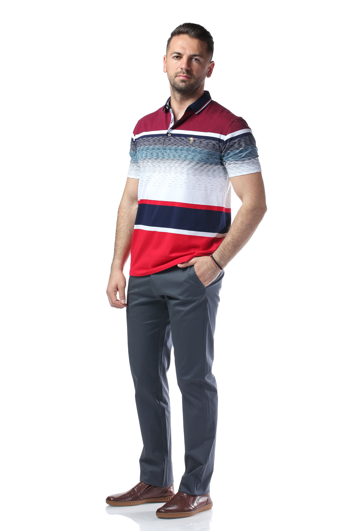 Tricou barbati de culoare grena cu dungi albe si bleumarin. Tricoul este model polo, gulerul este reiat si are fenta cu nasturi iar maneca este scurta. Este realizat din bumbac 95% si elastan 5%.