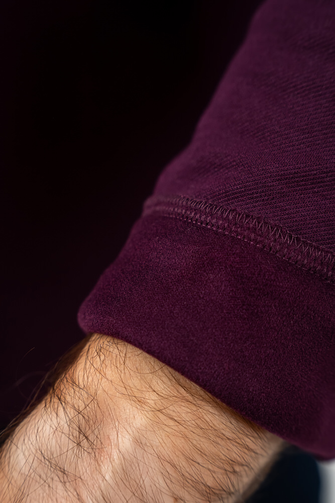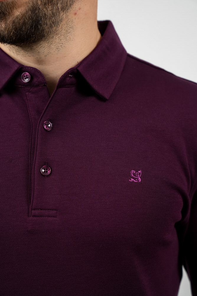 Tricou de culoare coacăză neagră, cu mânecă lungă tip polo și fenta cu trei nasturi.