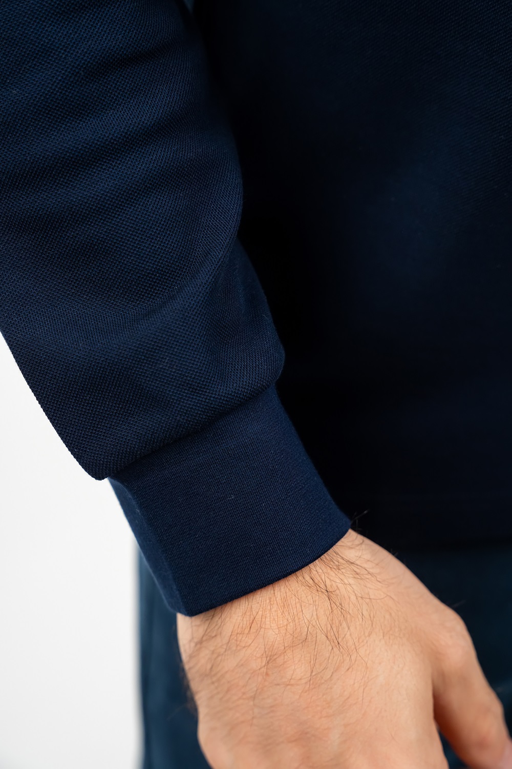 Tricou de culoare bleumarin cu dungi albe și bej, cu mânecă lungă tip polo cu guler reiat și fenta cu trei nasturi.